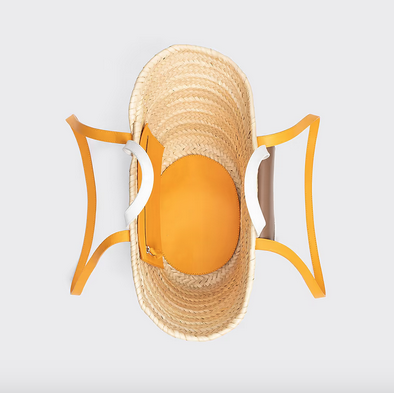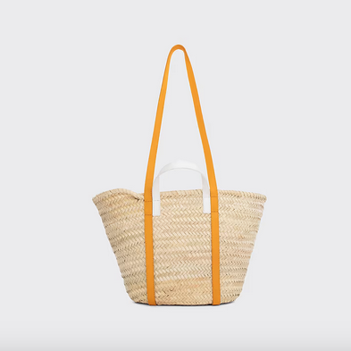 Cuir d'agneau camel & blanc cassé et cuir de veau mandarine & blanc. Tissé à la main, ce panier artisanal trouve son élégance dans la douce étreinte de sangles en cuir . Son extérieur comporte une poche ornée du motif emblématique ALPHA, tandis que la base intérieure en cuir ajoute à sa fonctionnalité.